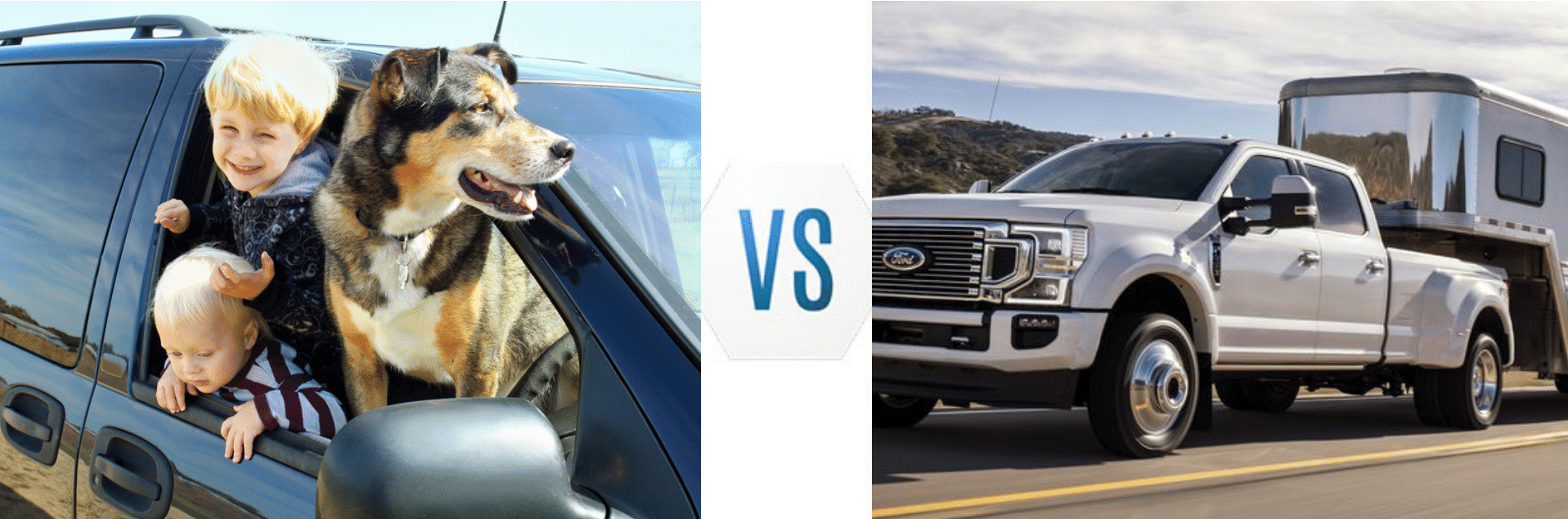 Image shows a Minivan vs. Ford Super Duty Pickup Truck Tableau