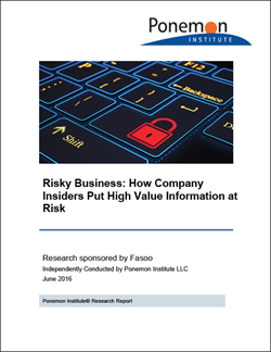 Fasoo just released the results of the security industry’s first look at how confident organizations are about protecting intellectual property and other high value information. In the latest Ponemon Institute survey titled, “Risky Business: How Company Insiders Put High Value Information at Risk”, 72 percent of organizations are not confident they can manage and control employee access to confidential documents and files. This study reveals that insiders are the highest security risk to an organization.