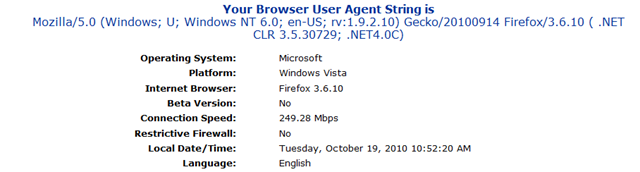 This shows I’m running Windows Vista and using a Firefox browser. It also picks up my IP address and a time/date stamp so it can tell what country or state I’m browsing from. The rest of the information identifies the technologies my browser supports. Websites use this information to present me with the best user experience based on the technology available on the platform I’m using. This is also how a website can present your mobile device with an optimized experience.