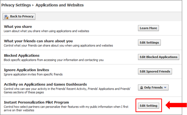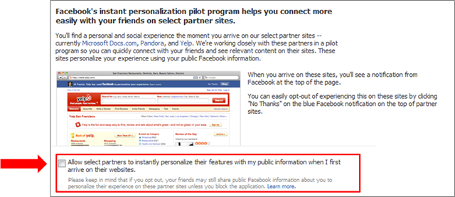 Below are some instructions to opt-out of the newest Instant Personalization Program, the latest issue.  If you want to opt-in, that is your right and privilege. Just make sure you read the fine print.  I have no problem with Facebook adding new features, as long as they are optional by default.