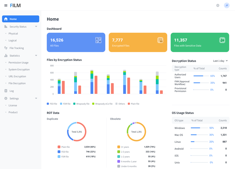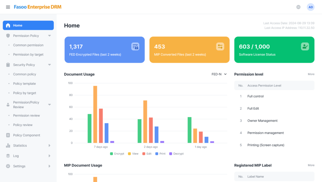 Fasoo Integrated Log Manager (FILM) collects document usage logs and tracking IDs through its proprietary MLB (Micro Log Block) technology.  It tracks all changes and user history from the initial creation of the document to its disposal to help you visualize data lineage. Through detailed tracking of documents, you can mitigate the risk of data leakage by trusted insiders. A dashboard of the location, usage, and encryption status of your sensitive documents helps you visualize data lineage and easily manage and track the overall security and flow of data. You can establish a more efficient and thorough security policy by managing logs from all security solutions in one place.