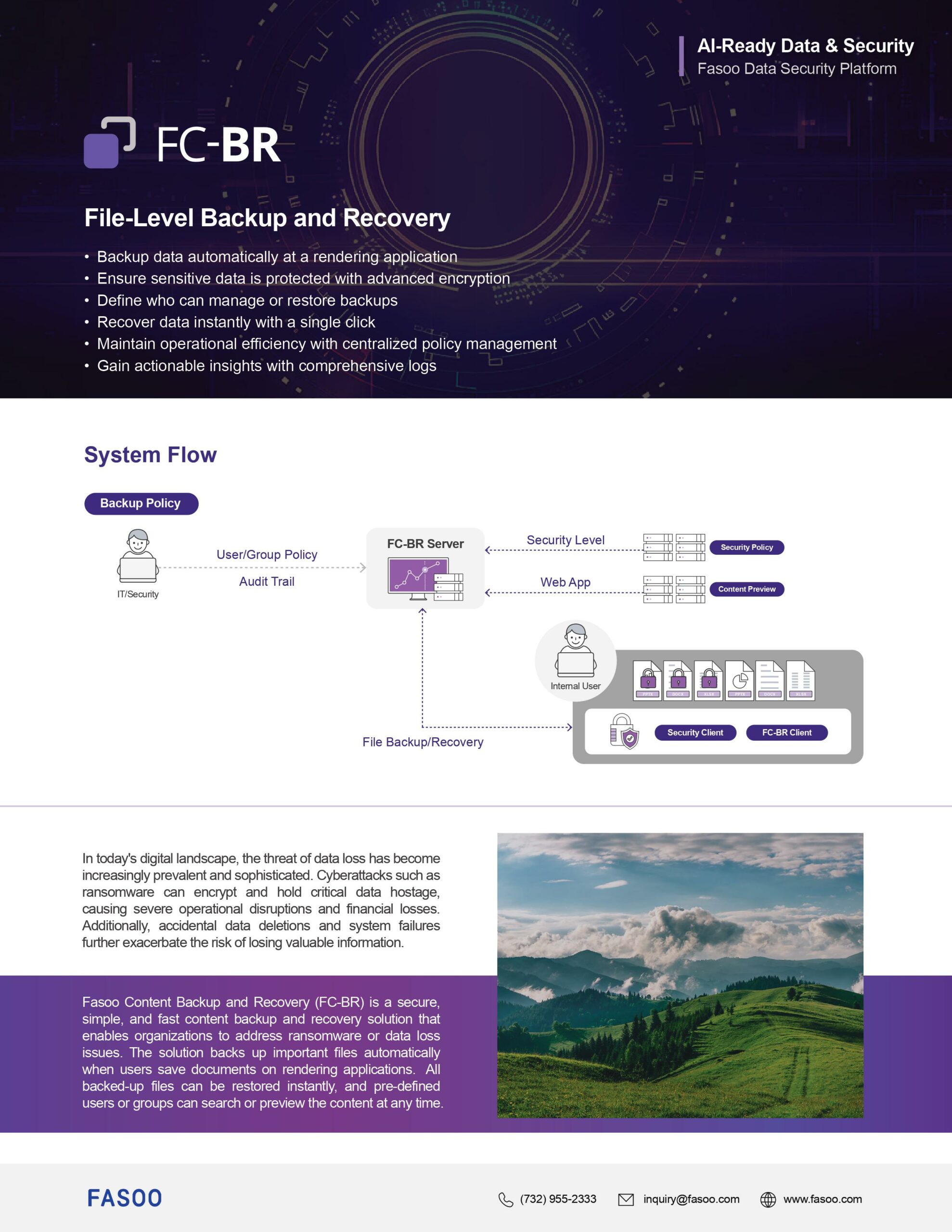 Fasoo Content Backup and Recovery (FC-BR) is a secure, simple, and fast content backup and recovery solution that enables organizations to address ransomware or data loss issues. The solution backs up important files automatically when users save documents on rendering applications. All backed-up files can be restored instantly, and pre-defined users or groups can search or preview the content at any time.
